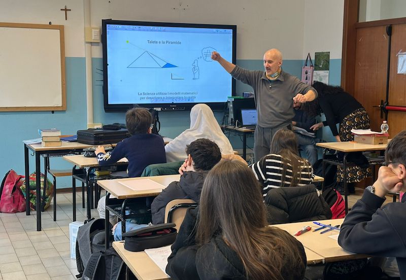 Il percorso ha incluso una visita al Planetario di Ravenna, dove gli studenti hanno preso parte a un’osservazione nella cupola e a un laboratorio pratico sulle stagioni e sulla luna. Successivamente, gli astronomi hanno tenuto laboratori direttamente in aula, con attività dal titolo “Stelle a colori”, a cura di Amalia Persico, per esplorare il mondo degli astri, comprendere il contributo delle donne nella scienza, realizzare esperimenti ed esplorazioni. Oriano Spazzoli, astronomo del Planetario di Ravenna, ha affrontato temi come la geometria e l’astronomia, con focus su Talete e il calcolo della piramide.
